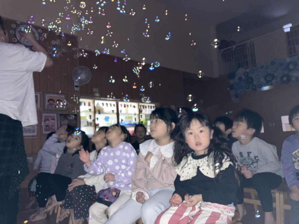イルミネーションの中でのシャボン玉。いろんな色で光っていたね☆