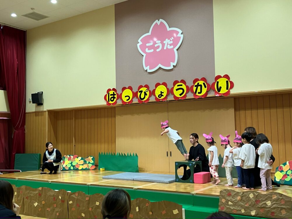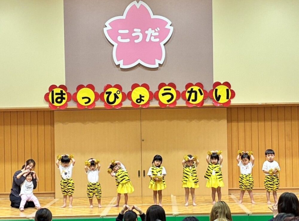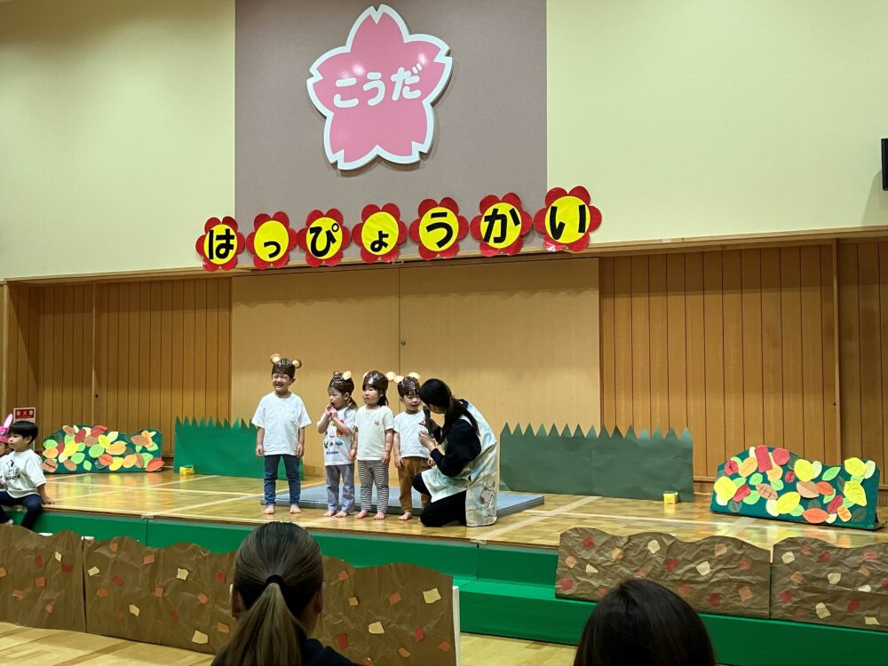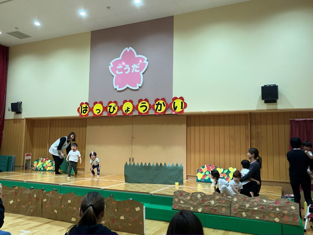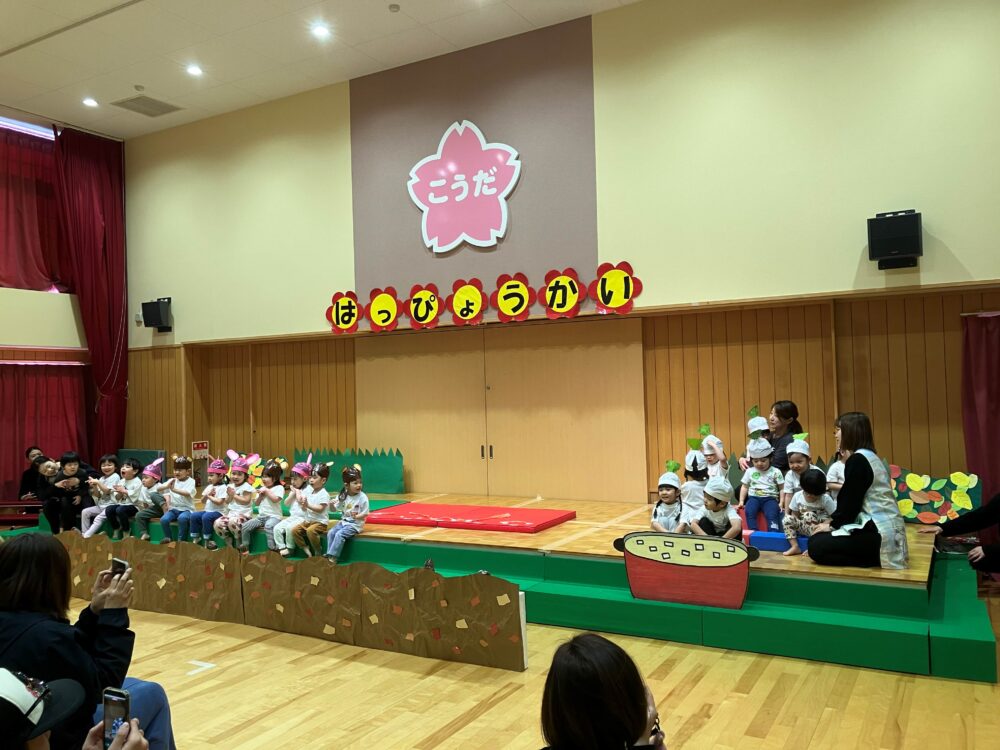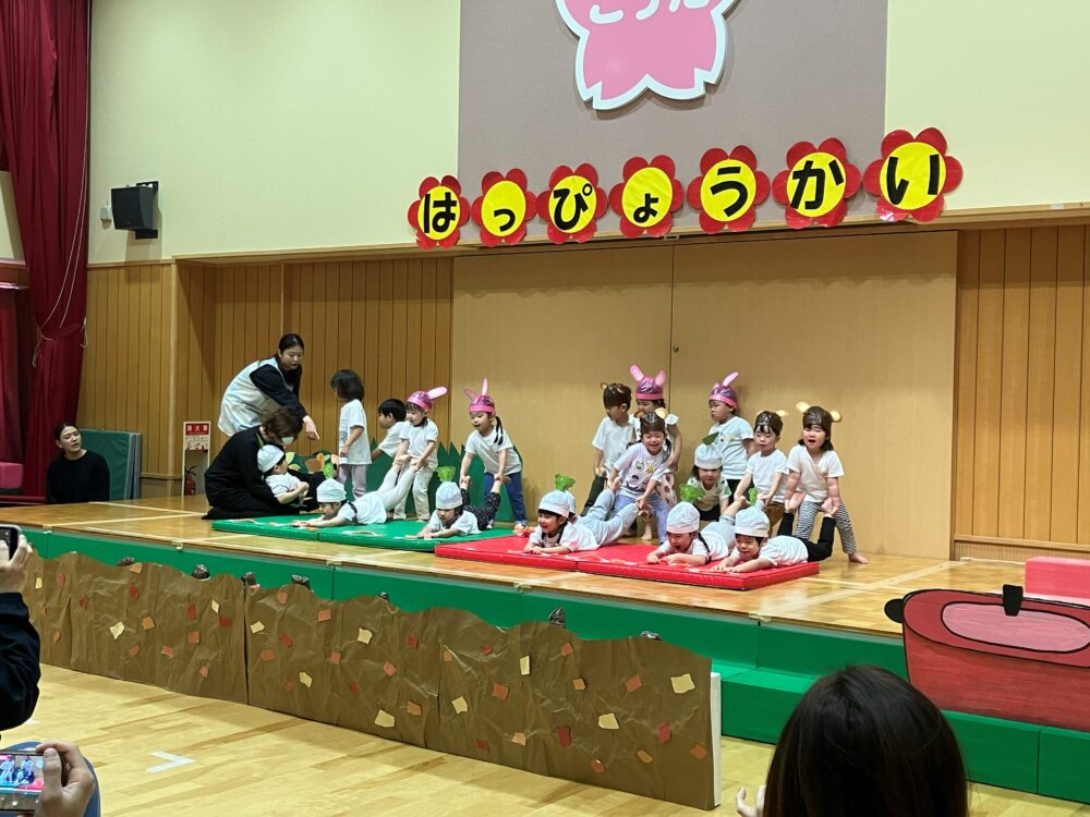 今日は2歳児の発表会がありました。劇ごっこでは「大きなかぶ」を、リズムあそびでは「ラムのラブソング」「ワイワイワールド」を発表しました。たくさんのお客さんを前にドキドキワクワクの子どもたち。いろんなかわいい表情がみられ、どの子も最後まで頑張って発表することができました。温かい拍手もたくさんいただき、ニコニコな子どもたちでした。