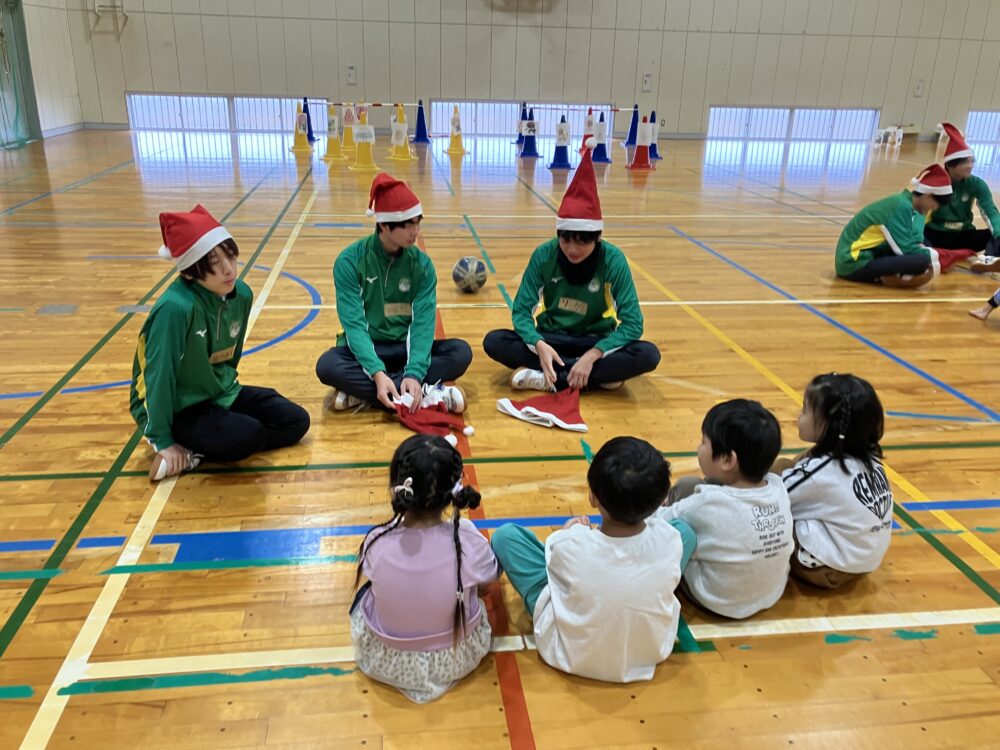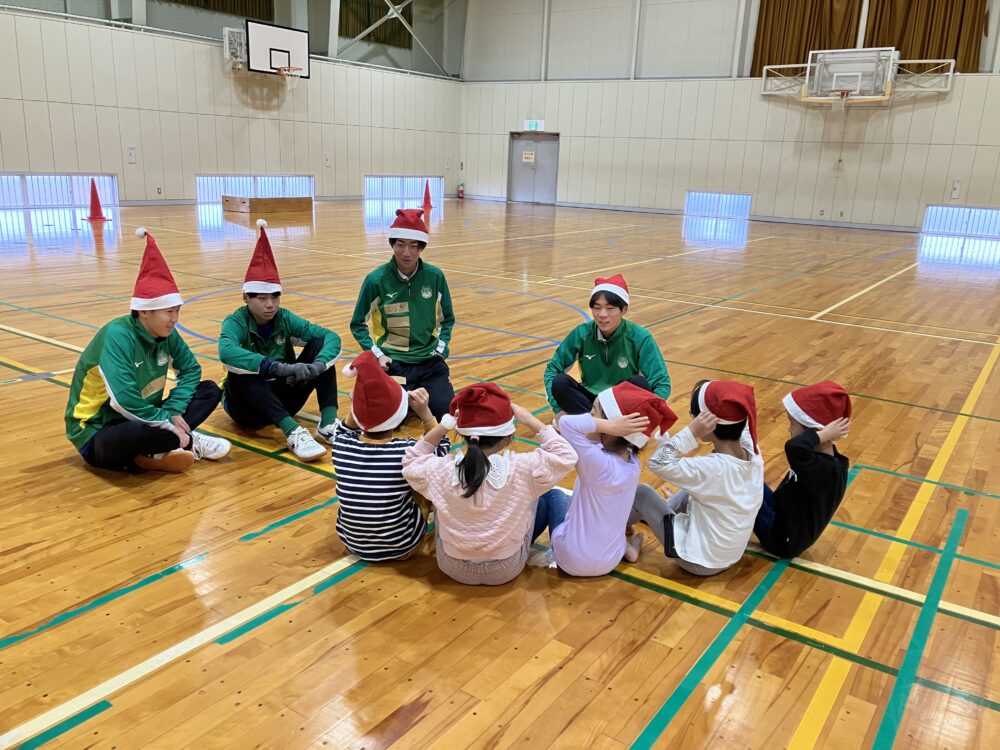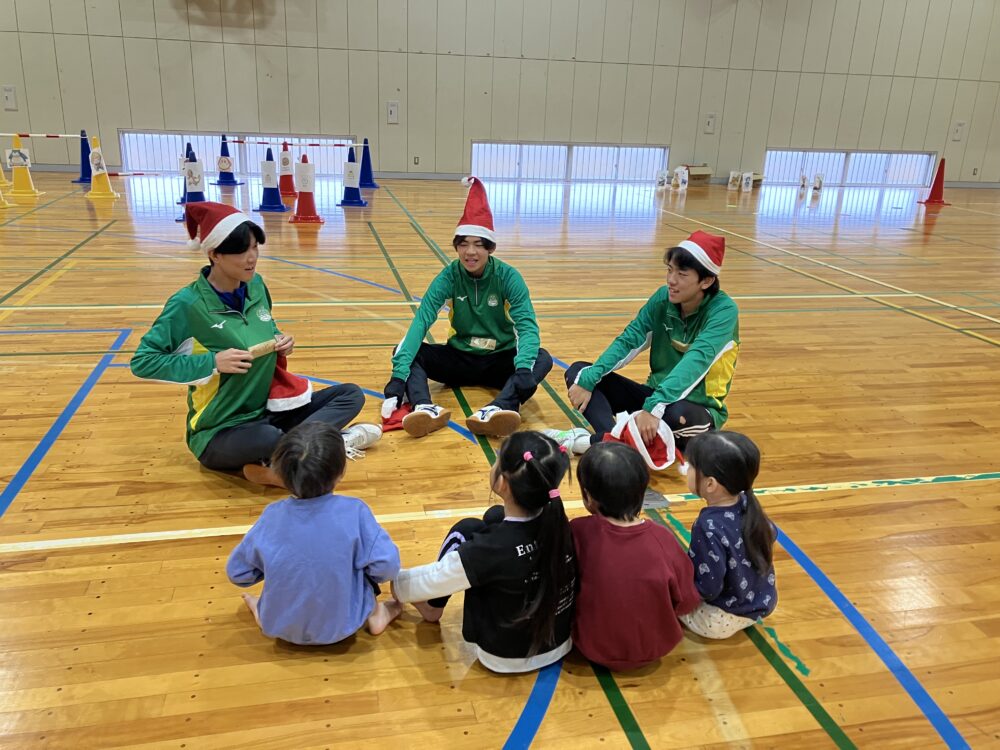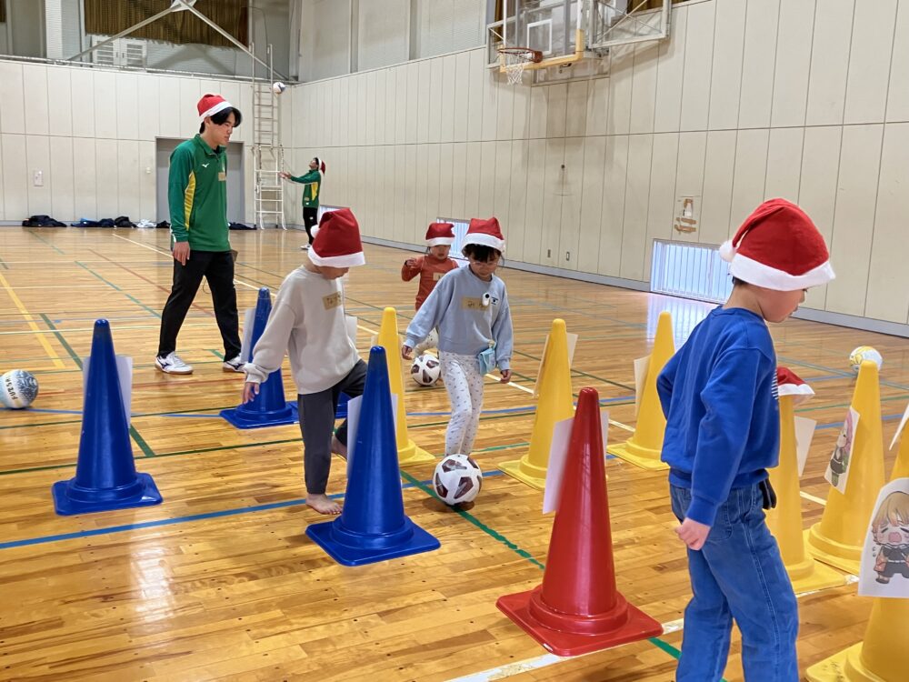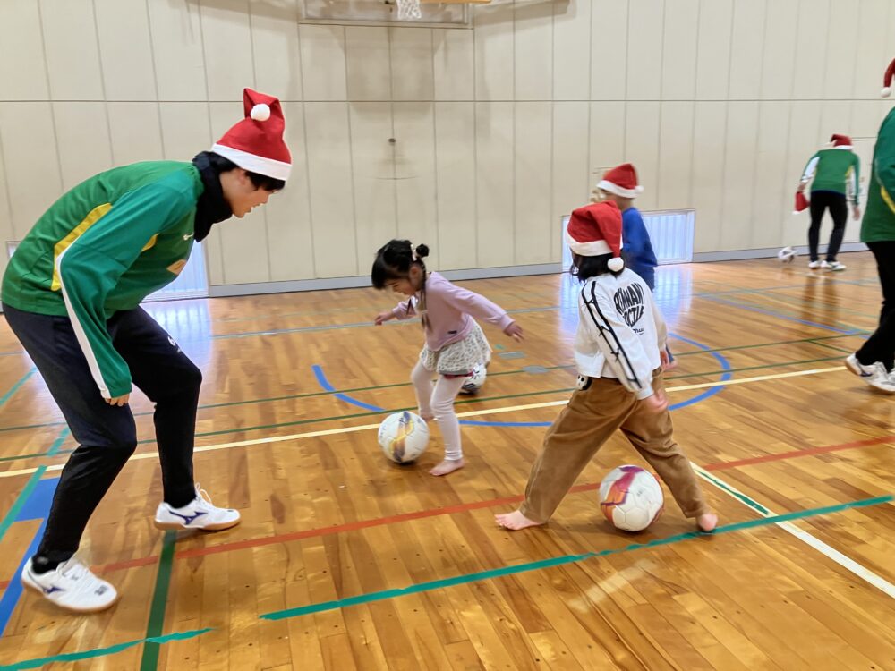 4グループに分かれ、小松市立高校のお兄さんたちにサッカーの楽しさを教えてもらいました。ボールに慣れるところから始まり最後はドリブルをして試合形式をしたり、蹴ってピンを倒す・ボールを持ってだるまさんが転んだ等みんなどのゲームも楽しんでいました。寒い体育館もみんなの熱気で暖かかったです。サッカーが好きになったかな?お兄さんたちのようにカッコいいお兄さんお姉さんになってね!