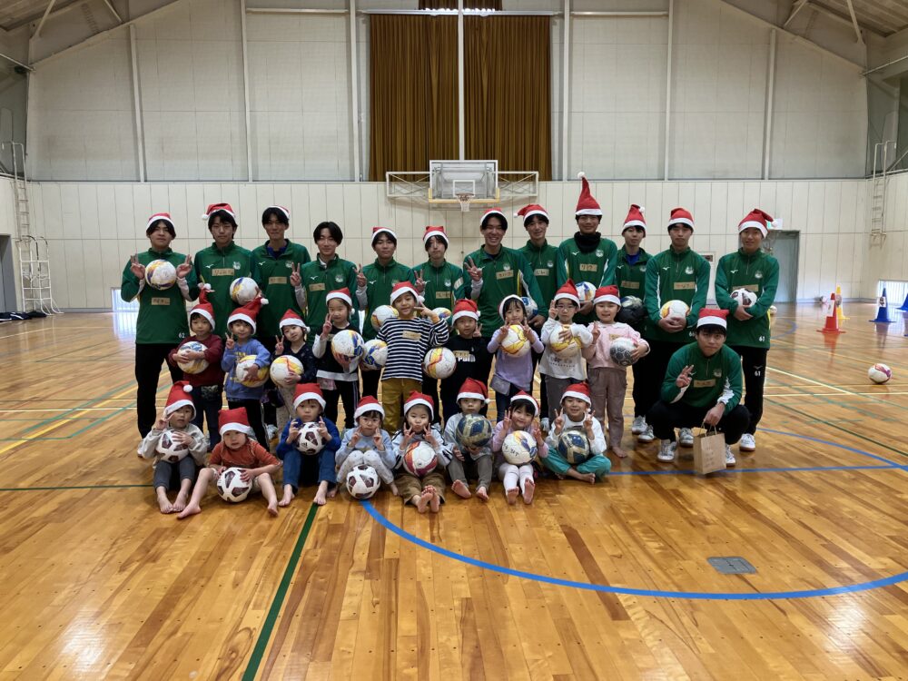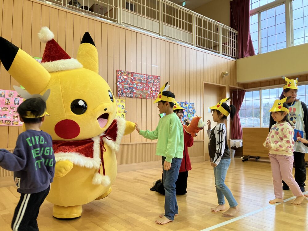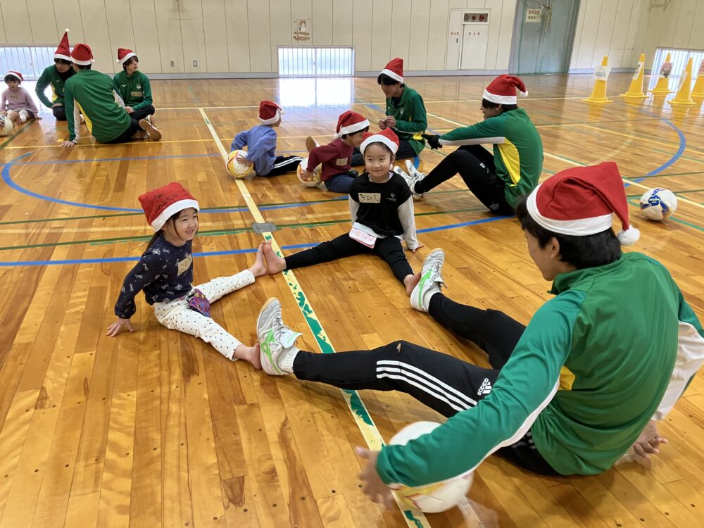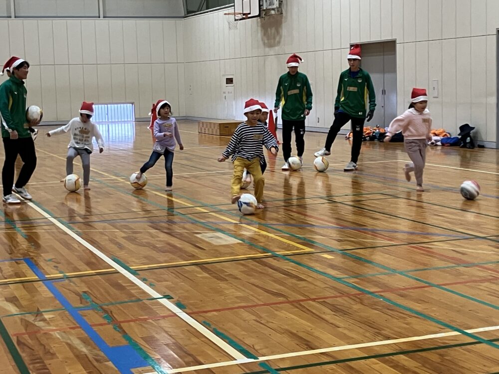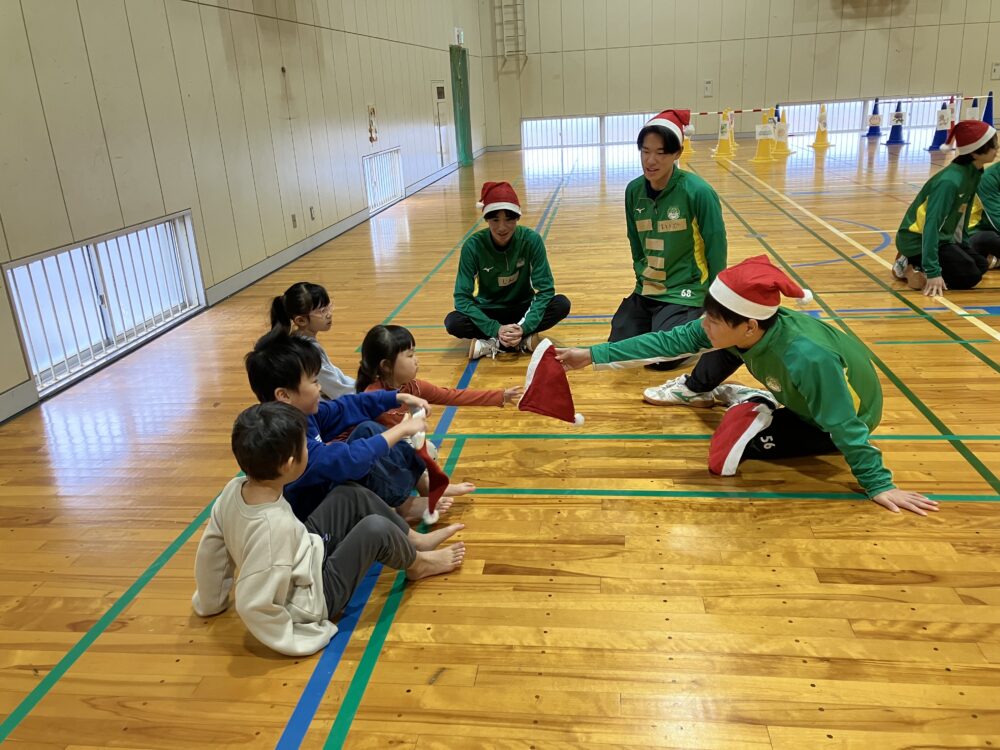 4グループに分かれ、小松市立高校のお兄さんたちにサッカーの楽しさを教えてもらいました。ボールに慣れるところから始まり最後はドリブルをして試合形式をしたり、蹴ってピンを倒す・ボールを持ってだるまさんが転んだ等みんなどのゲームも楽しんでいました。寒い体育館もみんなの熱気で暖かかったです。サッカーが好きになったかな?お兄さんたちのようにカッコいいお兄さんお姉さんになってね!