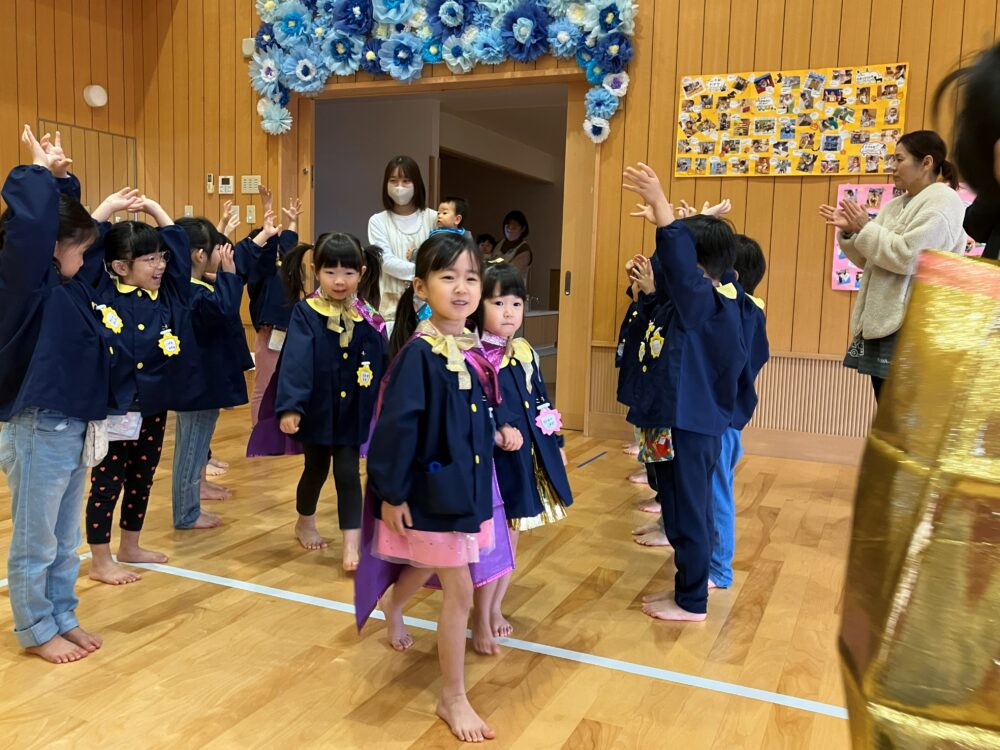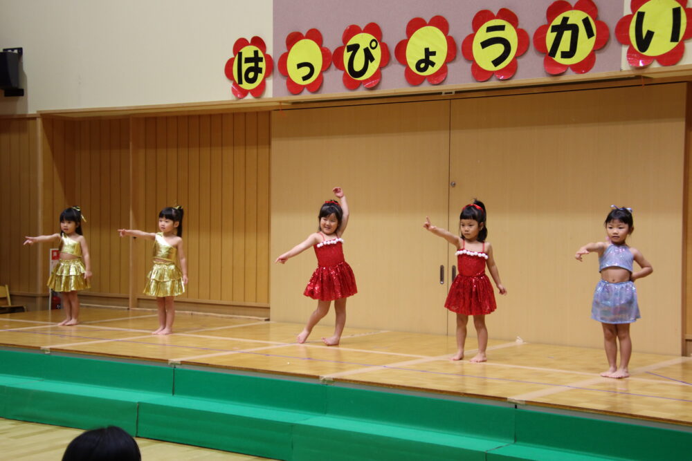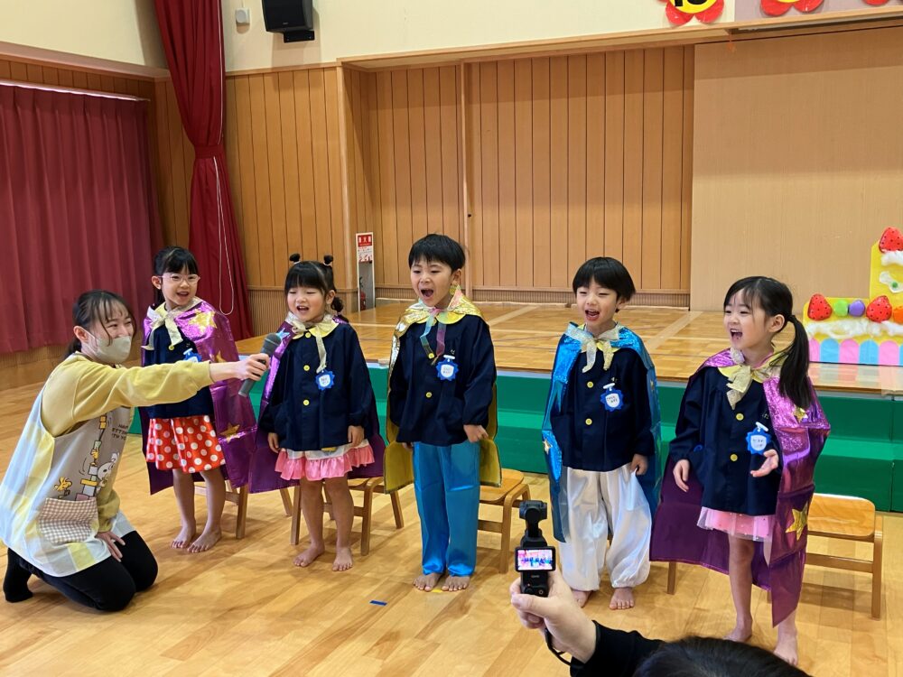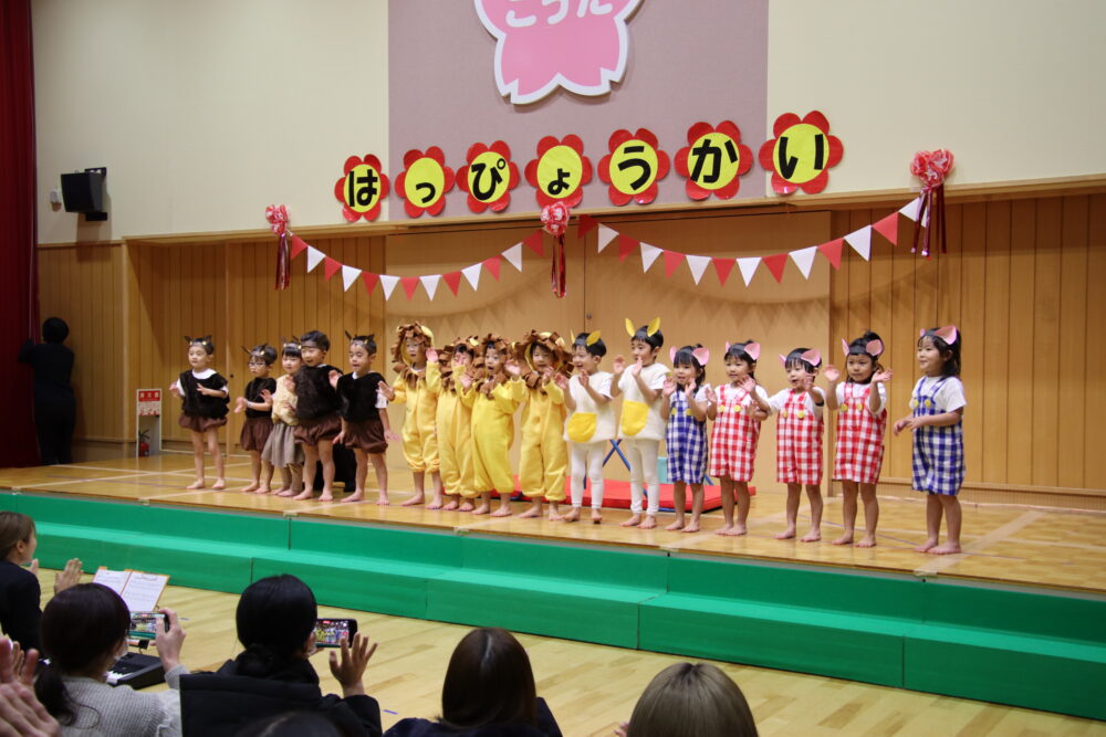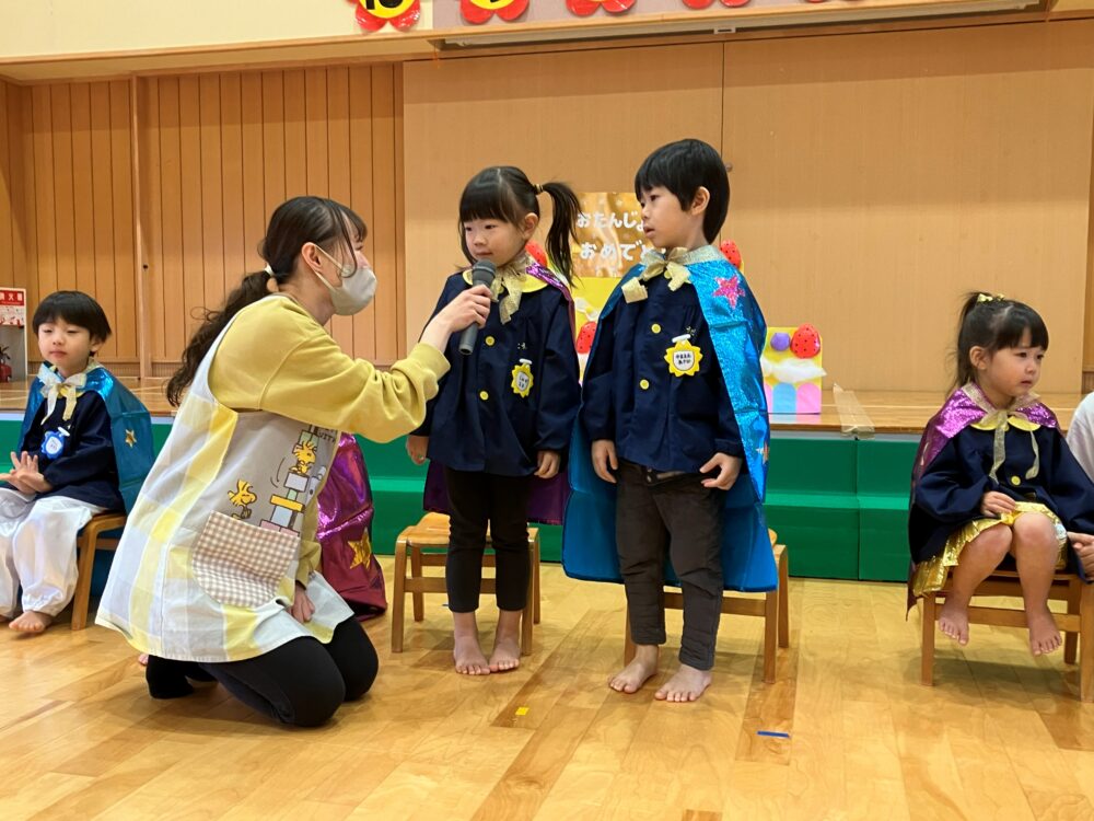 今日は、12月生まれのお誕生会をしました☆ 今月は、青組さん5人、黄組さん2人、桃組さん1人、ひよこ組さん3人の11人!!インタビューしたり、ハッピーバースデーのお歌を歌ったりしてみんなでお祝いしましたよ♪ お楽しみ会の最後は、青、黄、桃組さんによる発表会のリズム披露☆彡 素敵なダンスで会場がとっても盛り上がりましたよ。12月生まれのお友だち、素敵な1年になりますように・・・♡