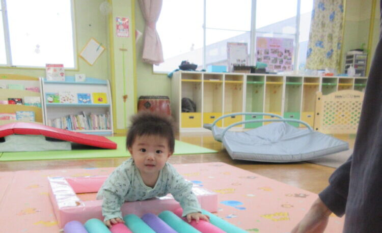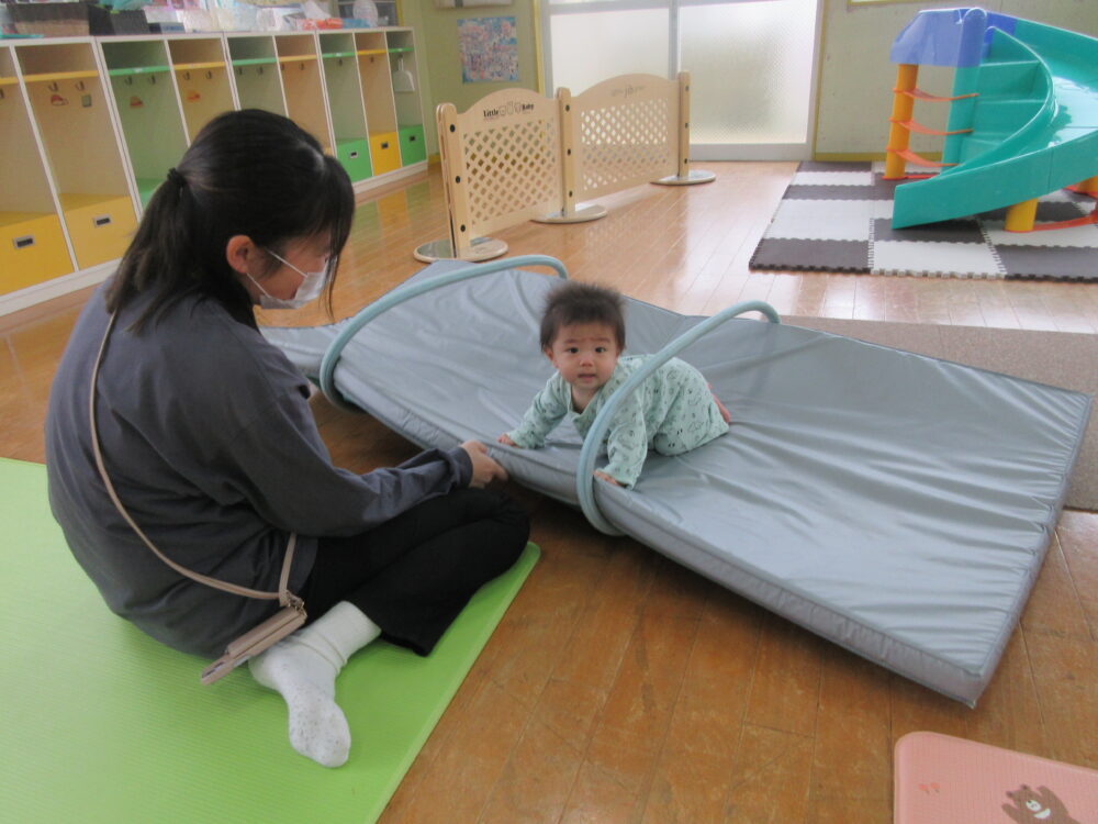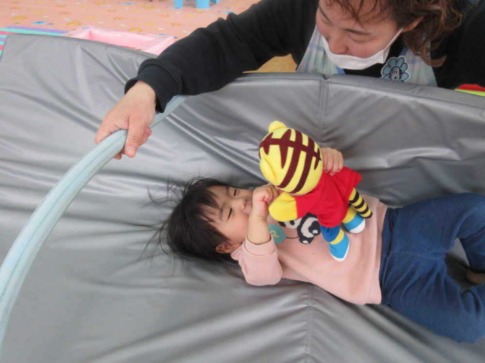 ずりばいやハイハイ、歩いているお友だちは、ゆるやかな山の上をハイハイで登り下り、カラーボックスのトンネルを登ったりくぐったり、不安定なマットの上で体を揺られて遊ぶなど、体を動かす楽しさをたっぷり味わいました。