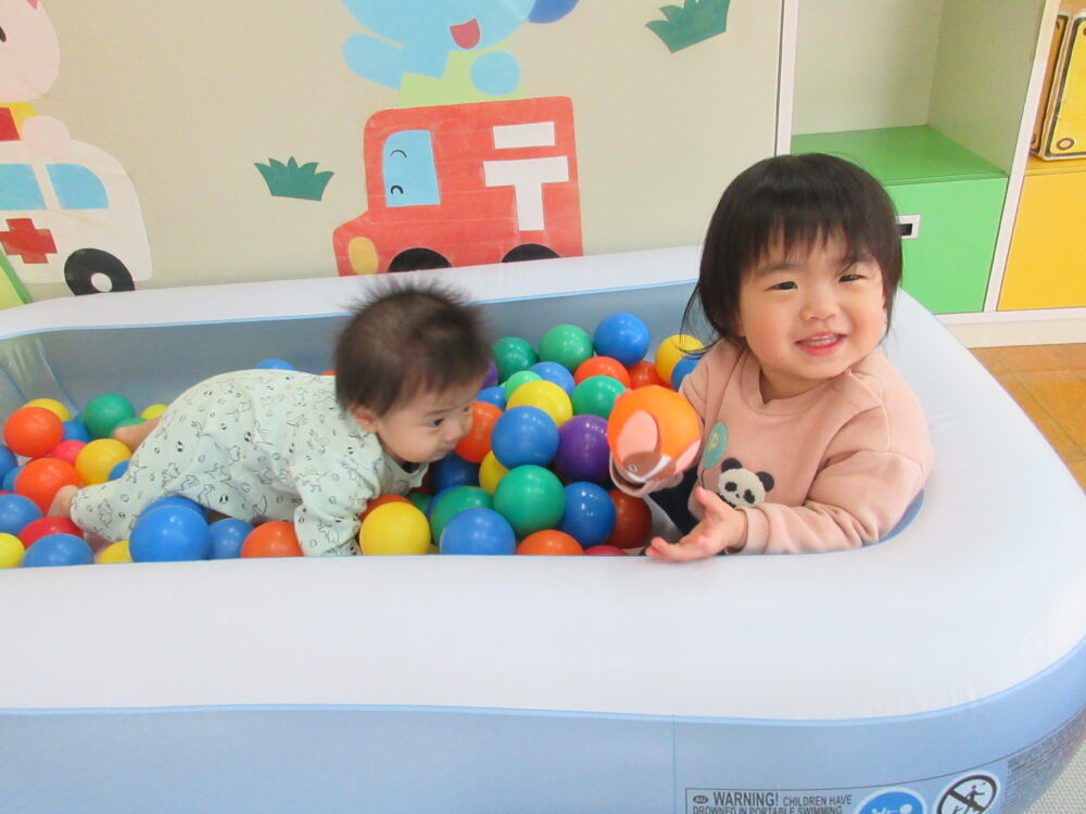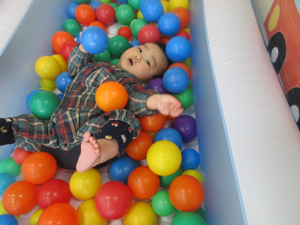 ボールプールのボールは、カラフルな色合いで、子どもたちも興味津々です。視覚的にも楽しめる運動遊びですね。